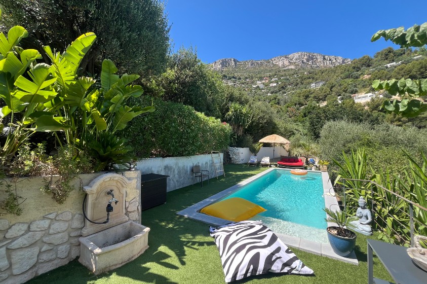 Eze, in the Saint Laurent district, built on a plot of 1314 m²,this charming house in excellent condition provides a beautiful outdoor space planted with trees and flowers, a pool area not overlooked, attractive terraces and a beautiful sea and nature view.The house is built on 2 levels, both opening onto the exterior.