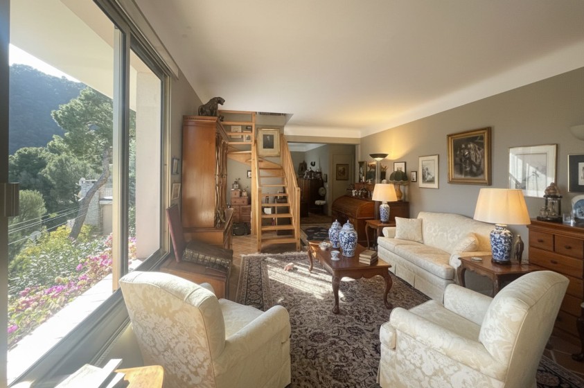 Exclusivité. Eze bord de Mer, dans un environnement privilégié, à moins de 10 minutes à pied de la plage, cet appartement de 135m² Loi Carrez, occupe le rez de jardin et le premier étage d'une maison composée de 2 lots d'habitation. Il offre une superbe vue sur la Méditerranée et d'agréables espaces extérieurs, terrasses et jardinet à usage privatif, idéal pour profiter du climat de la Côte d'Azur.L'appartement se compose d'un salon, une salle à manger, une cuisine séparée, 3 chambres, 2 salles de douches, un wc invités, une cave.