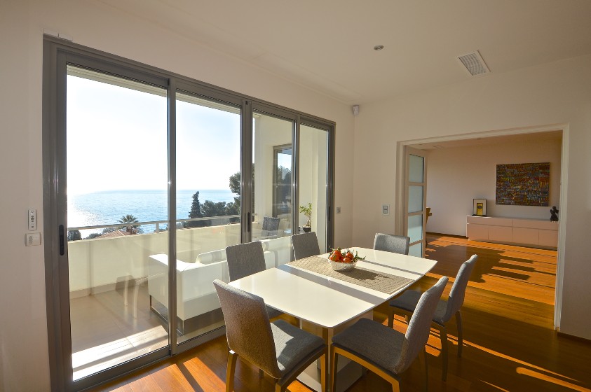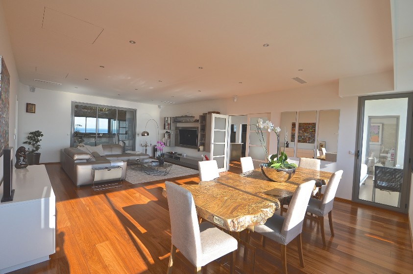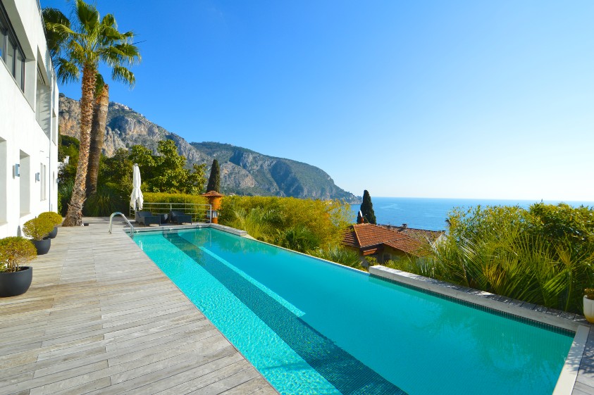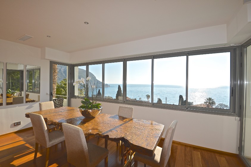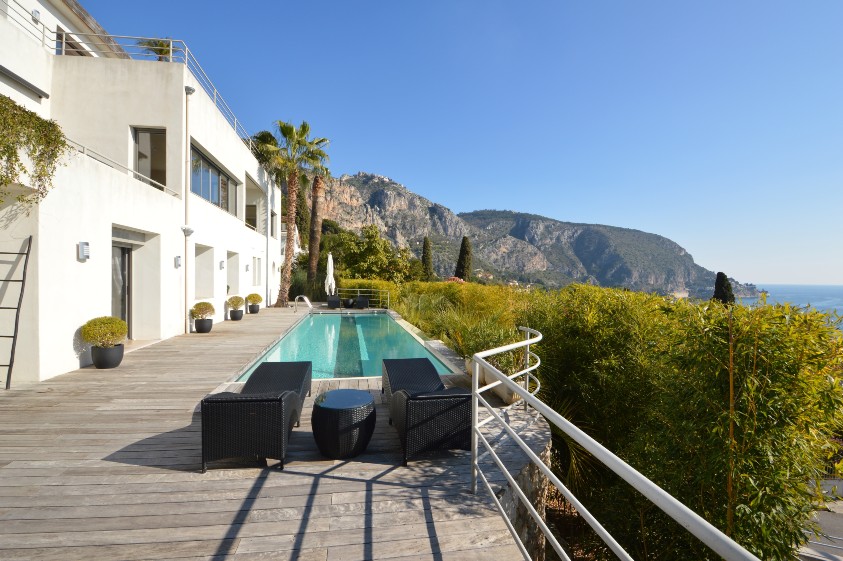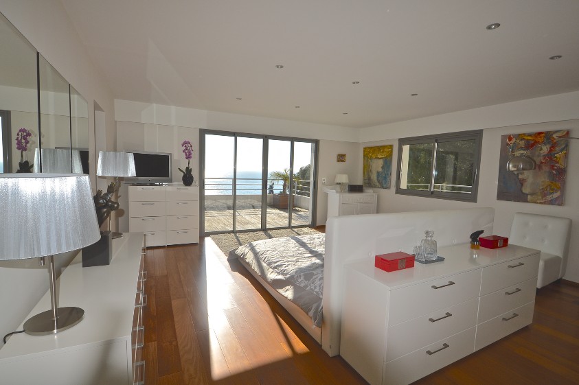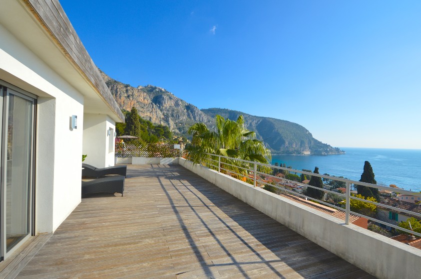 Superbe villa de style contemporain avec des vues panoramiques sur la baie d'Eze, idéalement située à environ 10 minutes de marche de la plage. L'architecture s inspire du style industriel et offre de grandes pièces lumineuses avec vue mer.La propriété est répartie sur 3 niveaux avec un hall d'entrée, une cuisine en plan ouvert avec une salle à manger familiale, une bureau ou chambre avec terrasse couverte, une douche, un vaste séjour menant sur une terrasse, 2ème salon en suite du séjour actuellement utilisé comme salle de sport, vue mer.