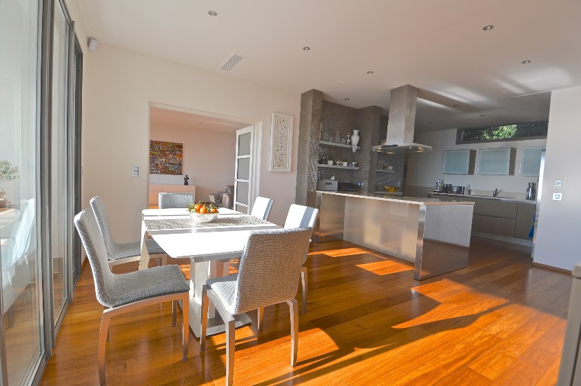 L'étage inférieur est divisé en 3 chambres avec salles de bains attenantes, et ouvre sur l'espace piscine, terrasse, salon d'été. La maison est entourée de jardinets plats et de terrasses.
