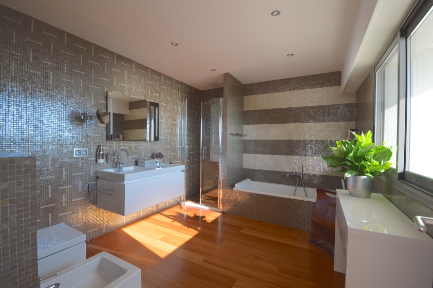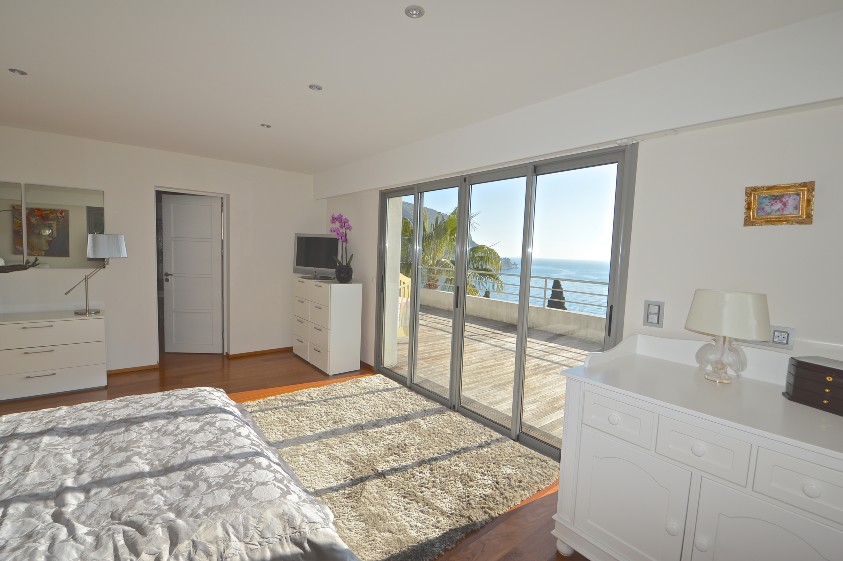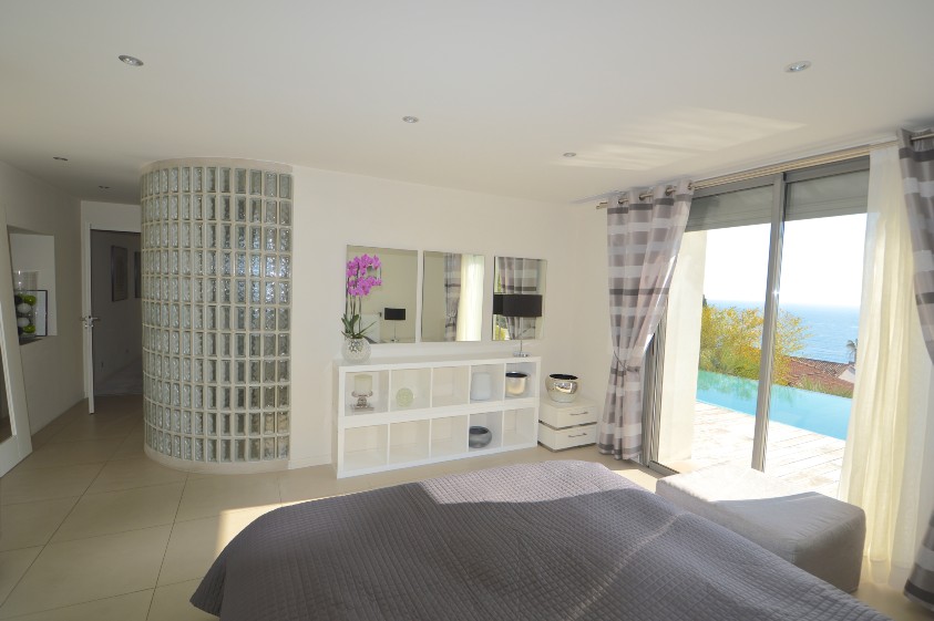 A l'étage supérieur nous avons une suite composée d'une grande chambre à coucher, solarium privée avec des vues exceptionnelles sur la baie avec ses pins parasols, salle de bains attenante avec baignoire et douche, dressing et bureau.