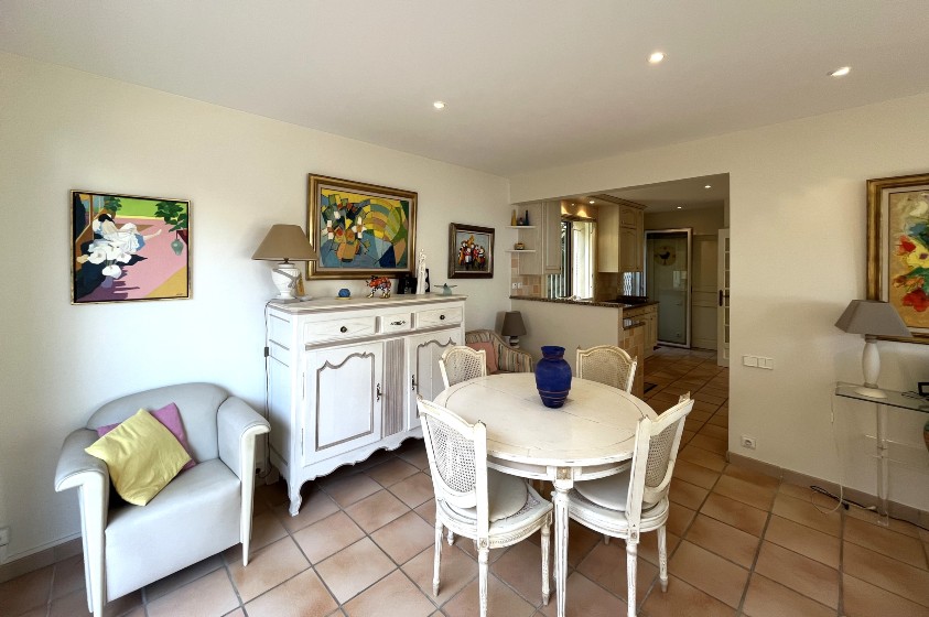 En rez de jardin, nous avons un agréable séjour ouvrant sur la grande terrasse en angle et un jardin sur l'arrière, cuisine équipée semi-ouverte, une chambre avec salle de bains, wc invités.