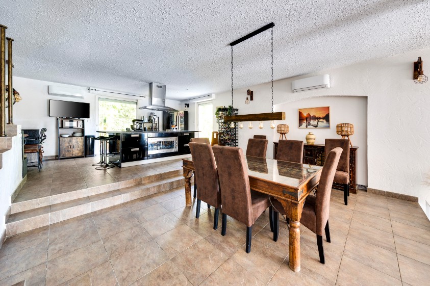Le salon principal spacieux et lumineux, s’articule autour d’une cheminée, apportant charme et chaleur à la pièce. En léger contrebas, accessible par une marche, un espace détente distinct crée une ambiance plus intimiste aménagé en salon-bar avec bibliothèque, canapé et espace jeux. L’ensemble constitue un lieu idéal pour recevoir ou profiter de moments de convivialité en famille ou entre amis.