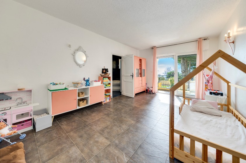La chambre parentale dispose d’un petit salon attenant, d’un dressing ainsi que d’une salle de bains avec douche et toilettes. Elle bénéficie également d’un accès direct à la terrasse et d’une agréable vue mer.